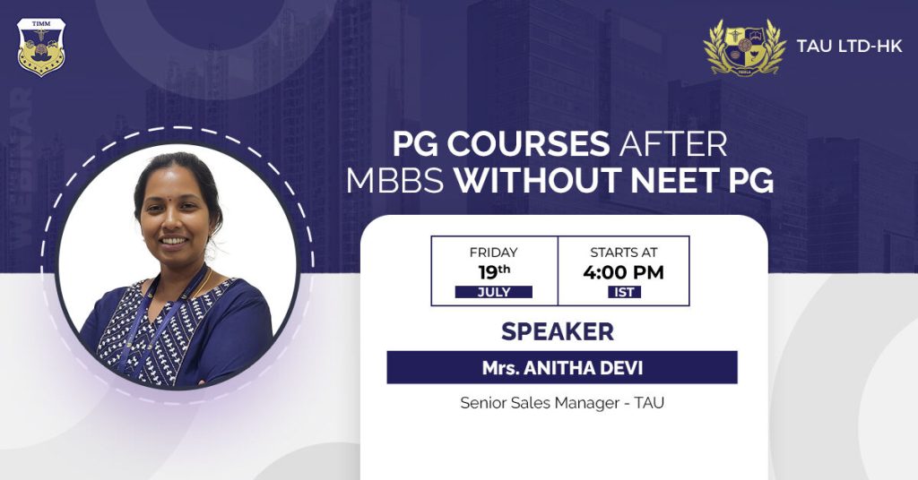 This webinar is designed to guide medical graduates in India on alternative pathways for pursuing postgraduate courses without the NEET PG examination. Mrs. Anitha Devi will discuss various opportunities, programs, and the unique advantages offered by TAU’s PG courses under the RCP program.